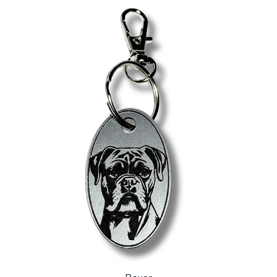 Each keyring features a detailed dog breed design, laser-cut and engraved in a sleek silver and black finish, complete with silver hardware so it’s ready to clip onto your keys, treat pouch, lead or bag.